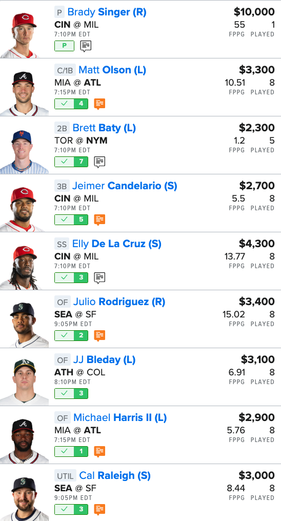 Here is our MLB “Main Slate” FanDuel Lineup for tonight: