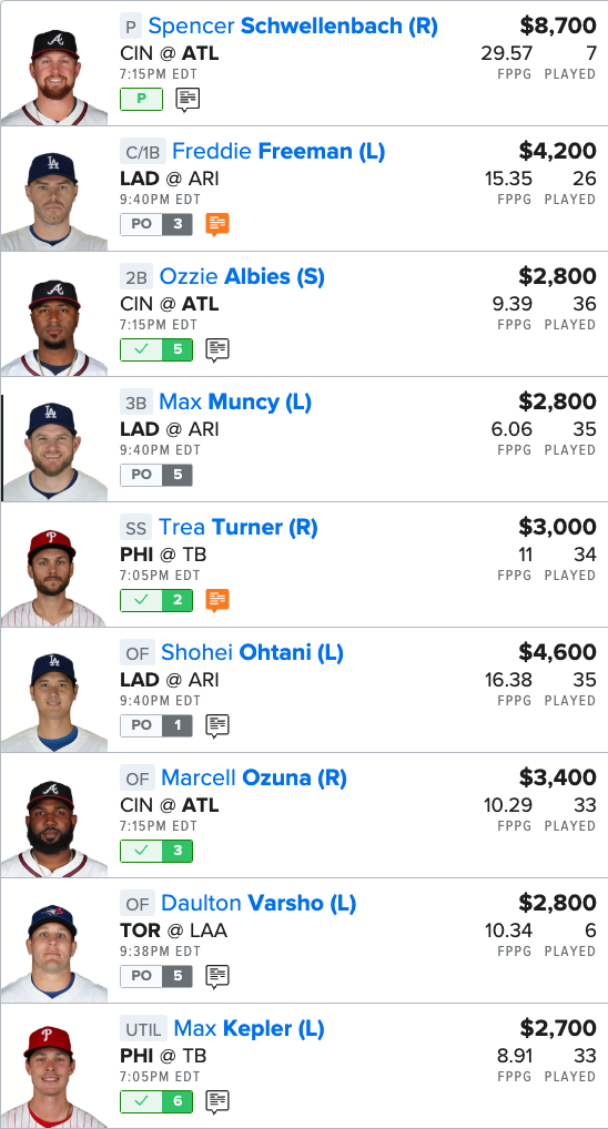Here is our MLB “Main Slate” FanDuel Lineup for tonight: