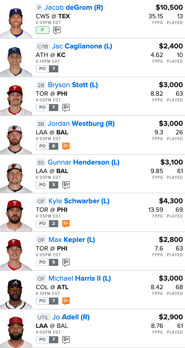 Here is our MLB “Main Slate” FanDuel Lineup for this afternoon: