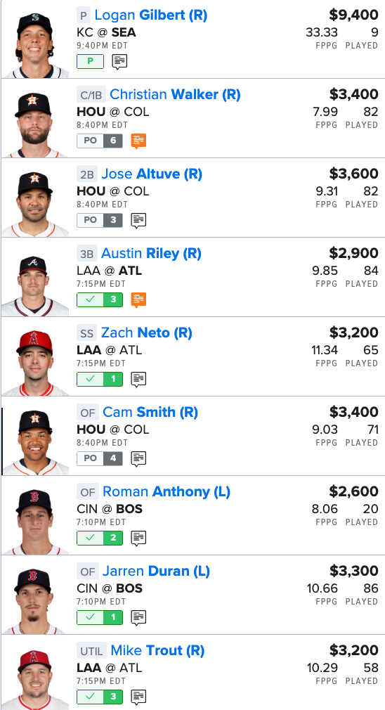 Here is our MLB “Main Slate” FanDuel Lineup for tonight: