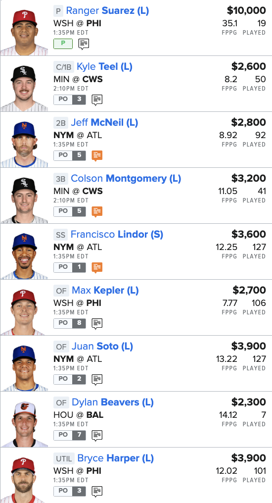 MLB DFS FanDuel Main Slate Lineup