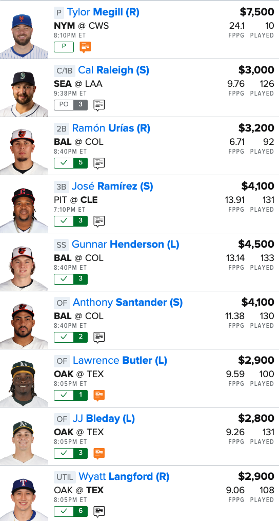 Here is our MLB “Main Slate” FanDuel Lineup for tonight:
