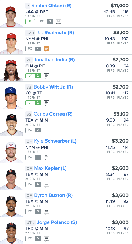 Here is our MLB FanDuel “Main Slate” Lineup for today: