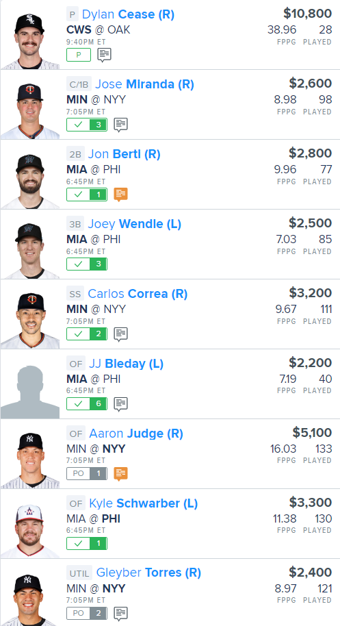 Here is our MLB FanDuel “Main Slate” Lineup for today: