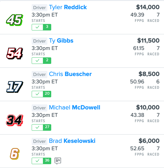 Here is our NASCAR FanDuel lineup for the EchoPark Automotive Grand Prix: