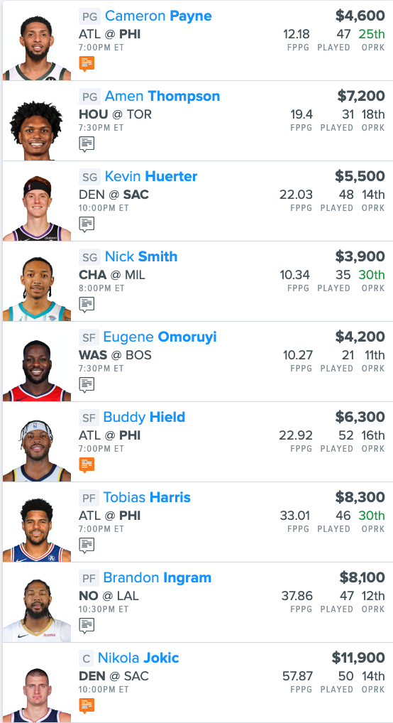 Here is our NBA “Main Slate” FanDuel Lineup for tonight:
