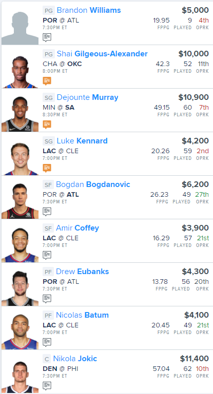 Here is our NBA FanDuel “Main Slate” Lineup for today: