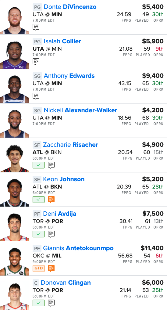 Update (5:44pm) – Z. Williams is out. Replacing him w/ Z. Risacher for ATL. Image is updated below. GL!