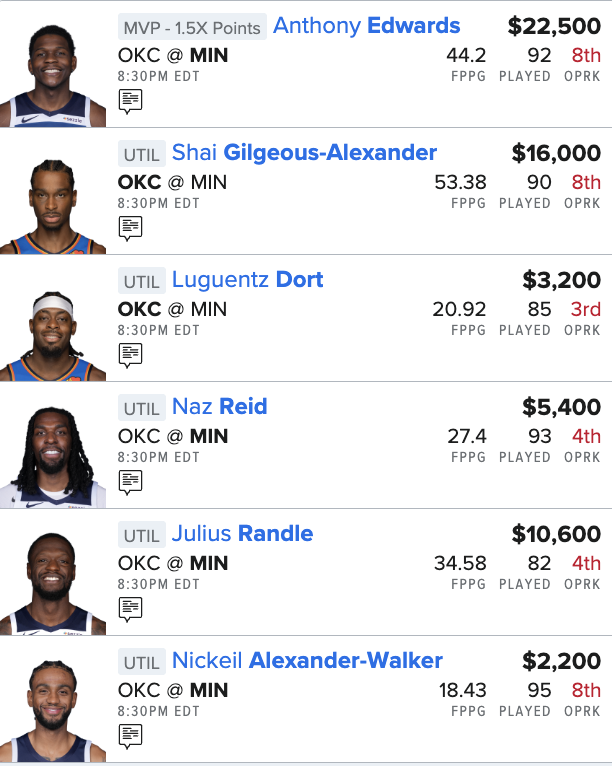 Here is our NBA “OKC @ MIN” Single Game Showdown FanDuel Lineup for this Monday night: