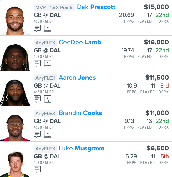 Here is our NFL “GB @ DAL” Single Game Showdown FanDuel Lineup for this afternoon: