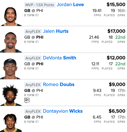 Here is our NFL “GB @ PHI” Single Game Showdown FanDuel Lineup for this Friday night: