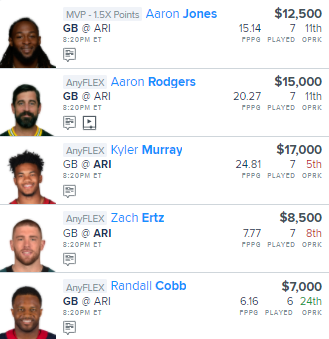 We have some NFL Thursday Night Football tonight as we have a great matchup with the Green Bay Packers taking on the Arizona Cardinals! Let’s take a look at our FanDuel “Single Game Showdown” for tonight that starts at 8:20pm (EST)!