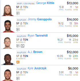 NFL DFS FanDuel San Francisco at Tennessee Game Showdown Lineup, Daily Fantasy Football Picks for 12/23/21