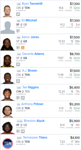 The NFL Playoffs continue this Saturday and we have two great games today with the Cincinnati Bengals vs. Tennessee Titans & San Francisco 49ers vs. Green Bay Packers! Let’s check out our NFL DFS “Saturday Only” FanDuel lineup that starts at 4:30pm (EST)!
