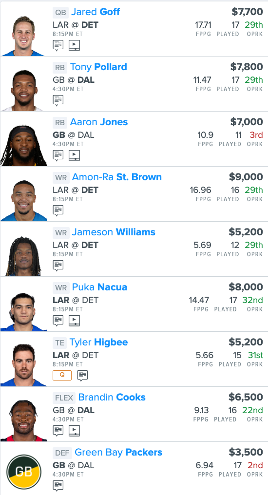 The NFL Playoffs continue this Sunday and we have two great games today with the Green Bay Packers vs. Dallas Cowboys & Los Angeles Rams vs Detroit Lions! Let’s check out our NFL DFS “Sunday Only” FanDuel lineup that starts at 4:30pm (EST)!
