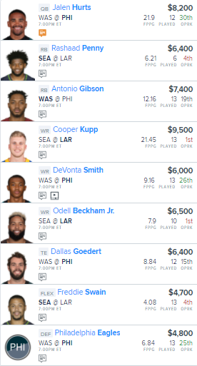 We have some rare NFL action this Tuesday night as we have the Washington Football Team vs. Philadelphia Eagles & Seattle Seahawks vs. Los Angeles Rams! Let’s check out our NFL DFS “Tuesday Only” FanDuel lineup that features 2 games and starts at 7:00pm (EST)!