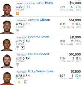 NFL DFS FanDuel Washington at Philadelphia Single Game Showdown Lineup, Daily Fantasy Football Picks for 12/21/21