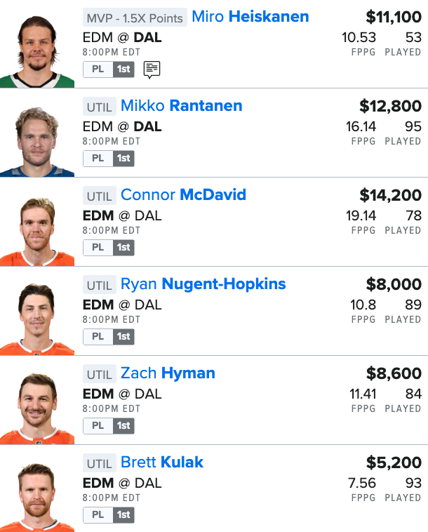 Here is our NHL “EDM @ DAL” Single Game Showdown FanDuel Lineup for this Wednesday Night: