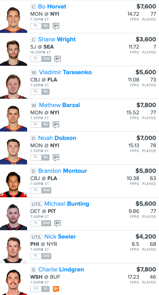 Here is our NHL “Main Slate” FanDuel Lineup for tonight: