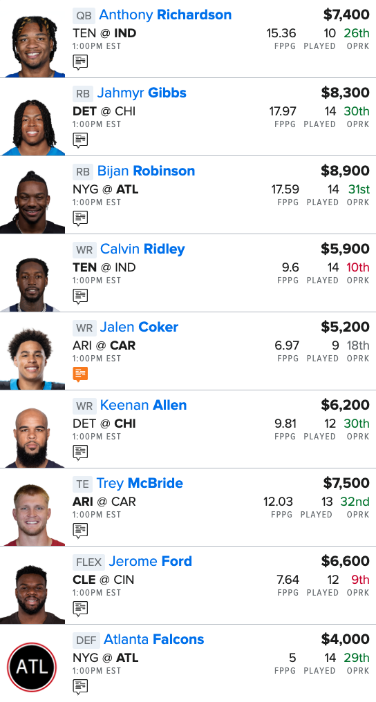 Here is our NFL “1PM Only” FanDuel Lineup for today: