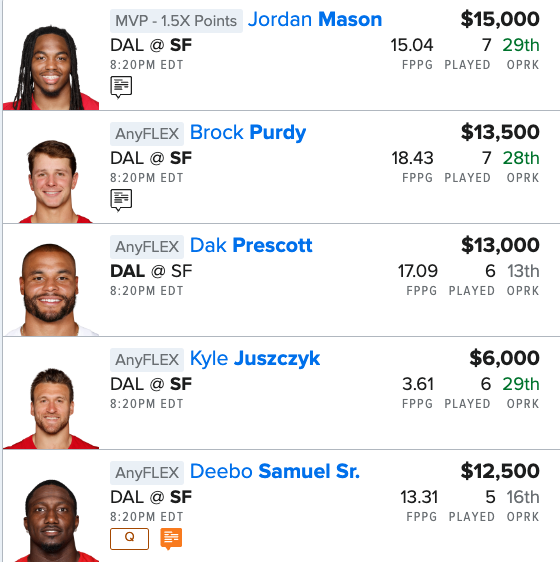 Here is our NFL “DAL @ SF” Single Game Showdown FanDuel Lineup for this Sunday night: