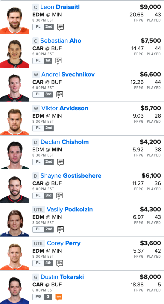 Here is our NHL “Main Slate” FanDuel Lineup for tonight: