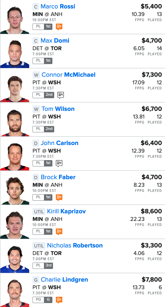 Here is our NHL “Main Slate” FanDuel Lineup for tonight:
